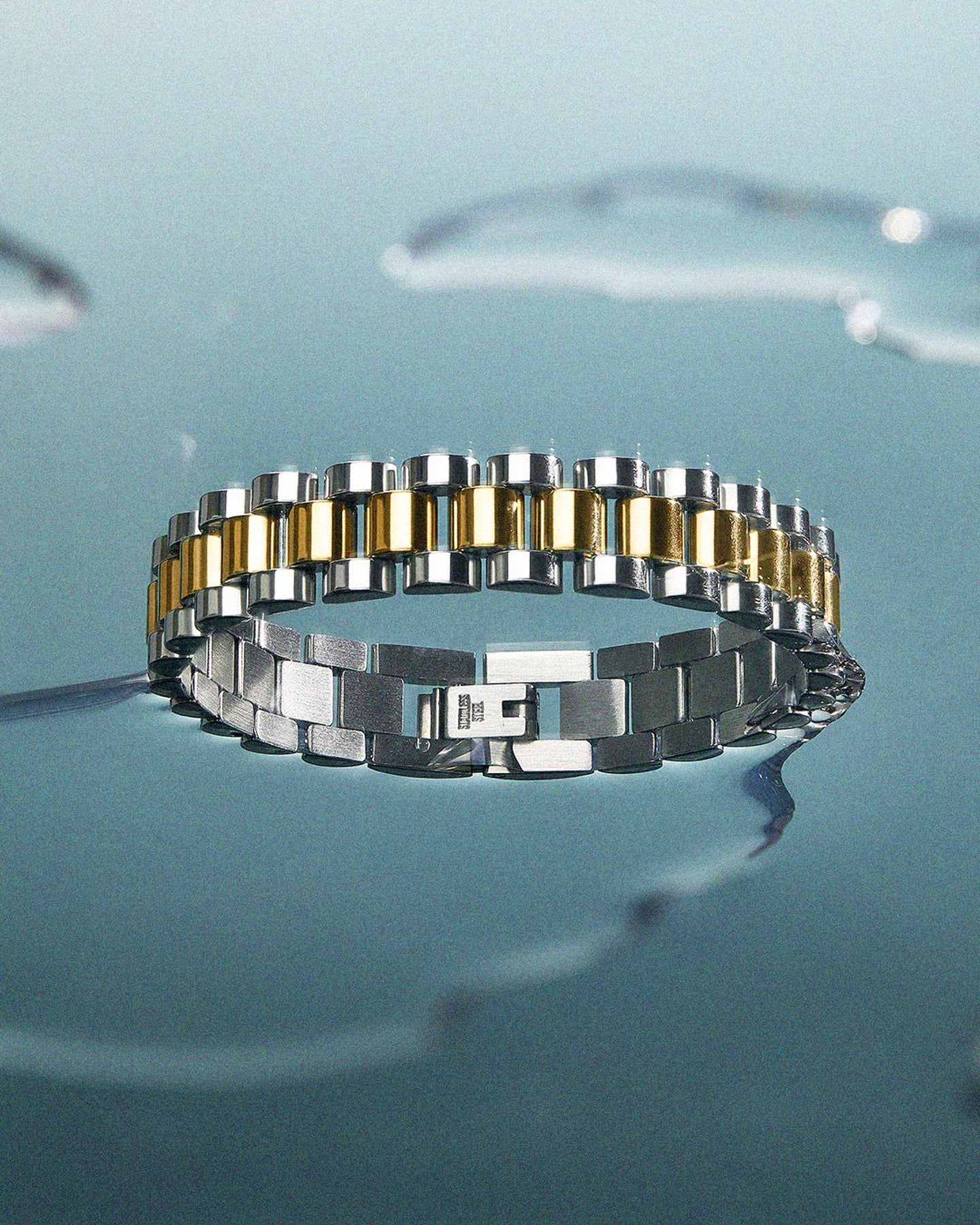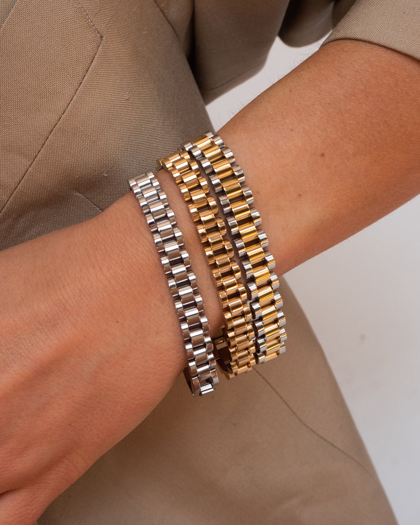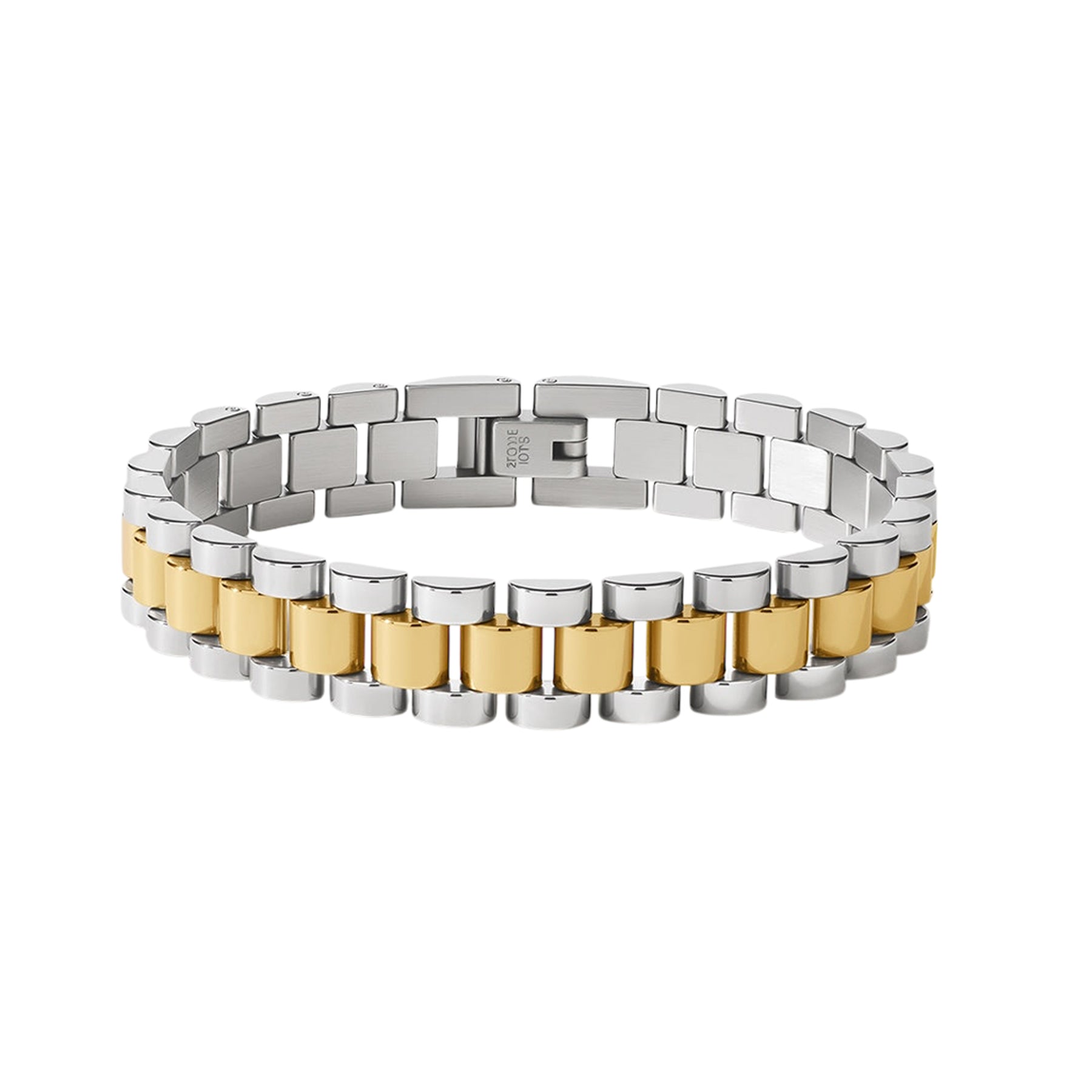 A timeless Timepiece bracelet. You will be flaunting this Luv Aj Two Toned Timepiece Watch Band Bracelet in Gold and Rhodium Silver Plated all day, everyday. A classic watch band bracelet made of Gold Plated and Rhodium Plated Mixed Metal links. Wearing this piece can be your staple accessory for mixing metals!
