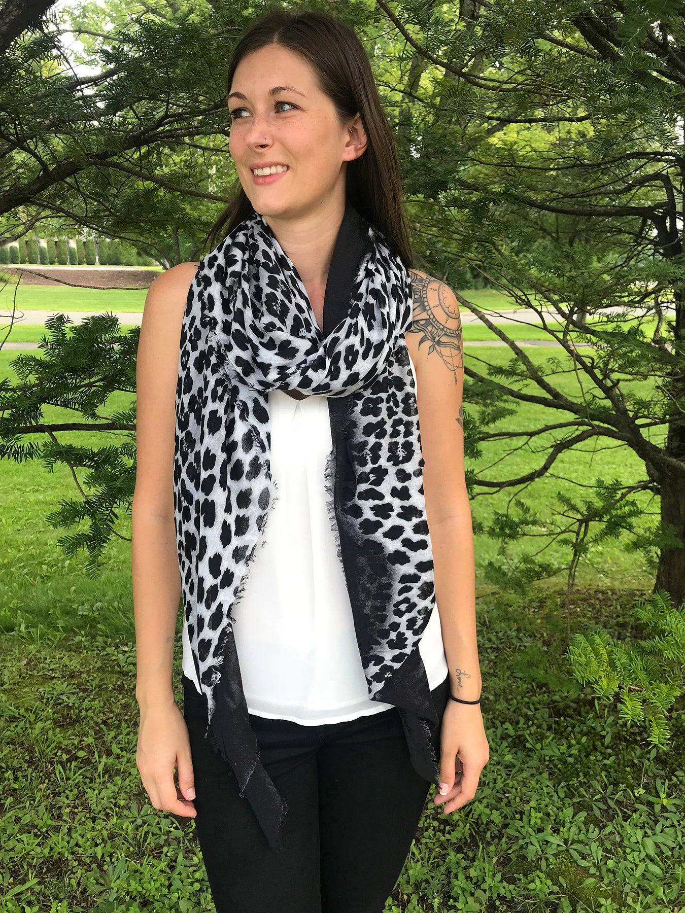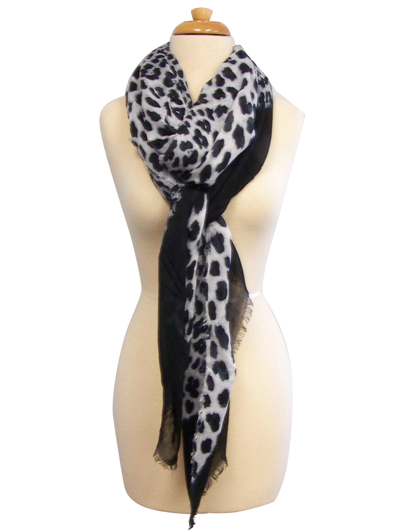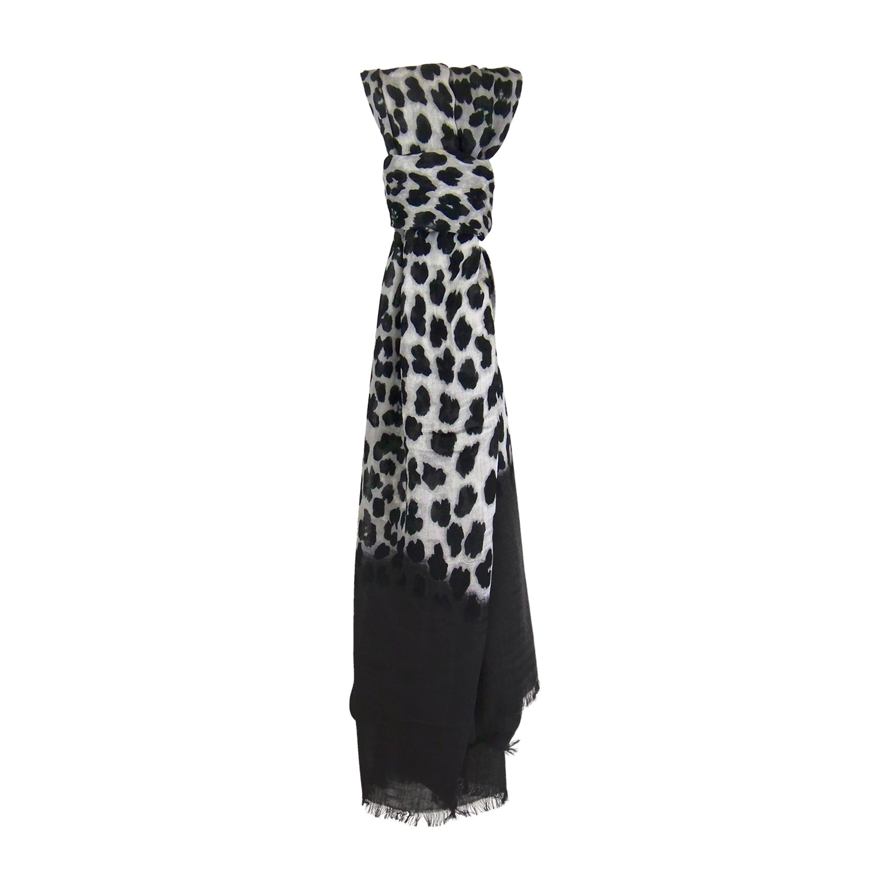Wrap yourself in this beautiful Animal Print Cashmere and Silk scarf from Blue Pacific. Black Border with Animal Print in Black and White will create a stunning look. Its generous size will allow you to use it as a wrap as well.