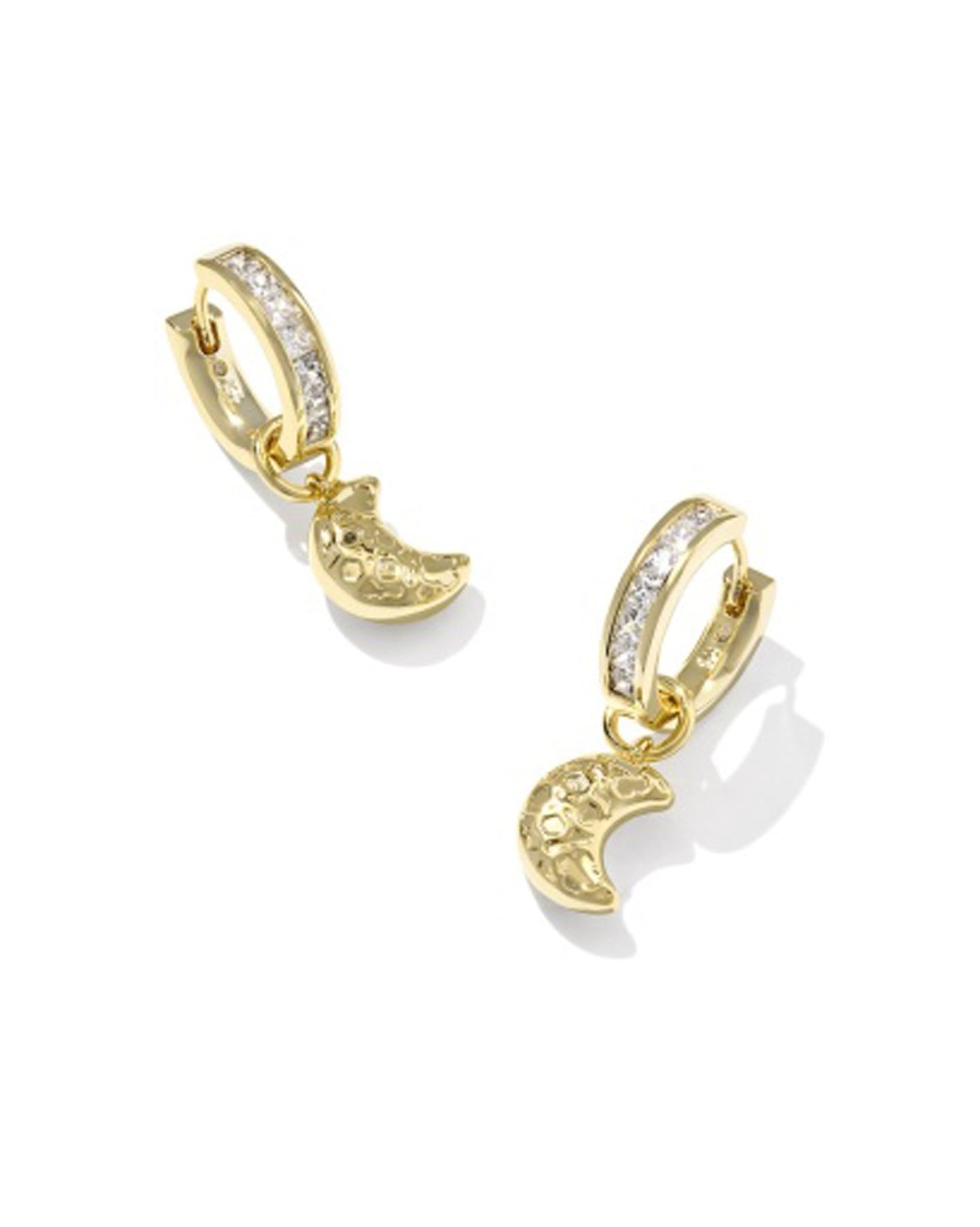 We are over the moon about these huggies! Let these Kendra Scott Moon Convertible Huggie Hoop Earrings in White Opalescent Resin and Gold Plated light up your night. These adorable Crescent Moon Huggies feature dangling Crescent moons made of 14K Gold Plated and White Opalescent Resin. The color of the stone is perfect for a moon! The earrings are reversible and convertible! The back side of the dangles are a shiny Gold Kendra Scott Logo Pattern, so reverse them if the earring stack calls for a full metal earring. The charms are also removable, so remove then if the earring stack calls for a simple huggie hoop.