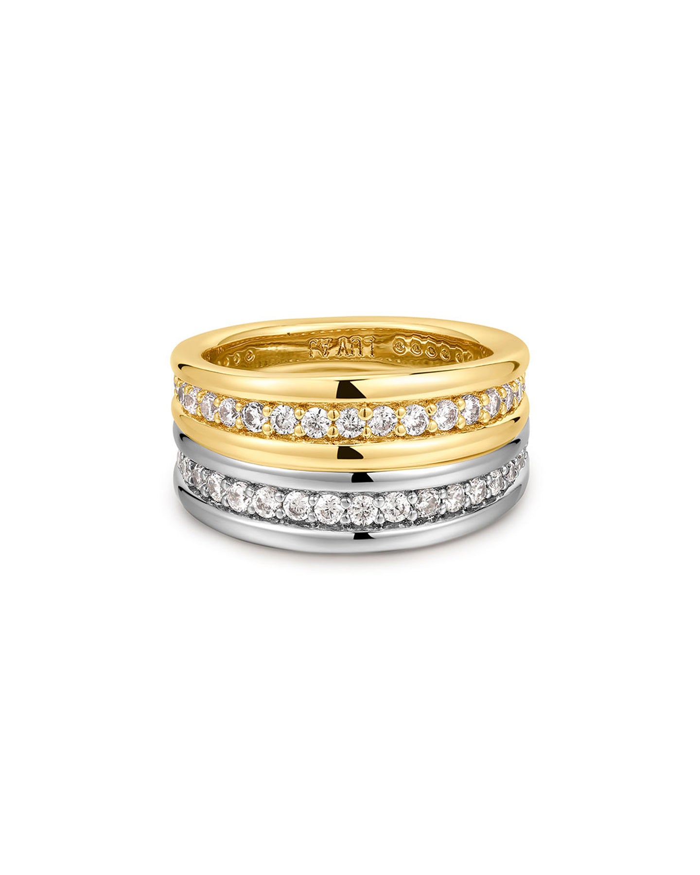 Luv Aj Wave Bezel Band Ring Set of Two in Two Tone Gold and Rhodium Silver Plated - Size 6